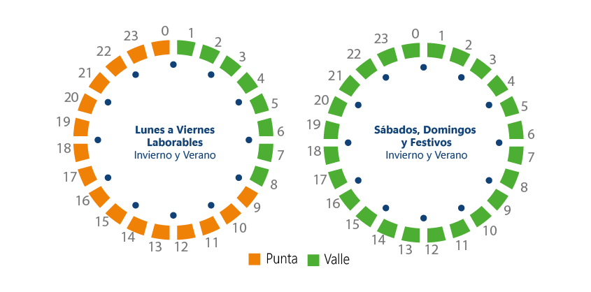 Horario Valle (precio más bajo) De L a V desde las 00:00h hasta las 08:00h. Todo el día los fines de semana y festivos